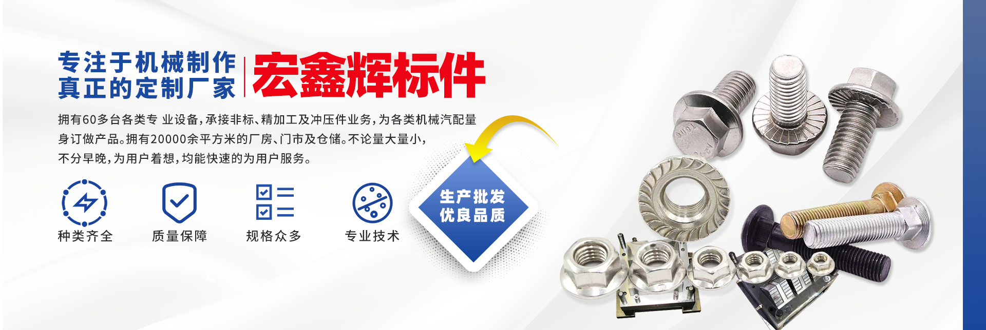 四川宏鑫輝標(biāo)準(zhǔn)件制造有限公司下設(shè):南充市宏輝機(jī)械制造有限公司,南充市聚宏機(jī)電設(shè)備有限公司,公司始建于1994年。為了拓展市場(chǎng),降低成本,本公司于2007年、2020年分別在南充、 成都、重慶創(chuàng)建了生產(chǎn)基地。擁有60多臺(tái)各類(lèi)專(zhuān) 業(yè)設(shè)備,承接非標(biāo)、精加工及沖壓件業(yè)務(wù),為各 類(lèi)機(jī)械汽配量身訂做產(chǎn)品。擁有20000余平方米的廠(chǎng)房、門(mén)市及倉(cāng)儲(chǔ)。公司以誠(chéng)信為本,竭誠(chéng)為廣大客戶(hù)提供服務(wù)。不論量大量小,不分早晚,為用戶(hù)著想,均能快速的為用戶(hù)服務(wù)。 公司所生產(chǎn)及代理的產(chǎn)品為業(yè)界人士公認(rèn)的國(guó)內(nèi)、國(guó)際優(yōu)等品牌。在產(chǎn)品性能與質(zhì)量